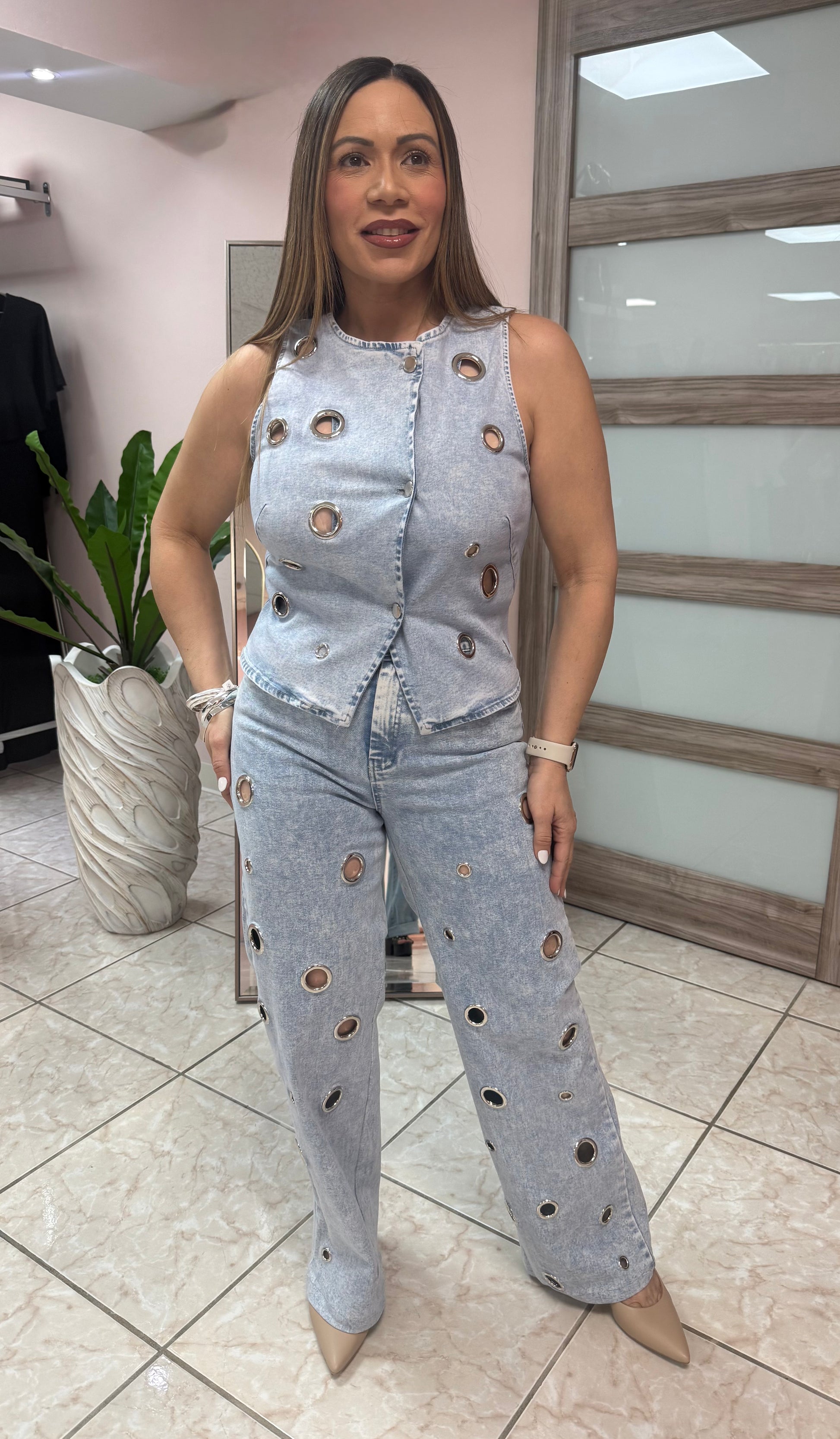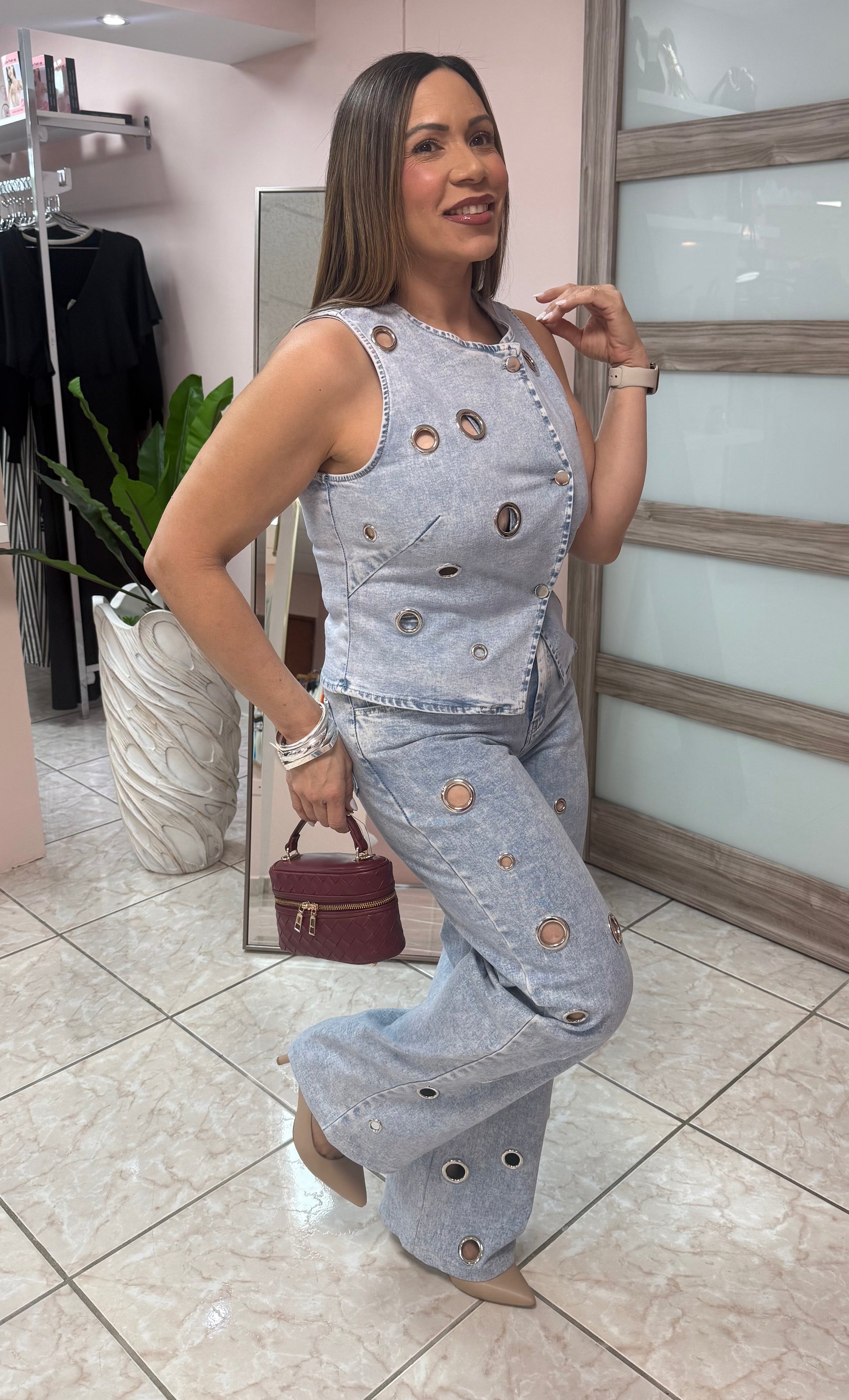 70% polyester 28% cotton 2% spandex. Conjunto de dos piezas en mahón con detalles plateados súper chic. Detalles solo en el frente. Modelo usa talla medium. Tiene muy buen spandex.