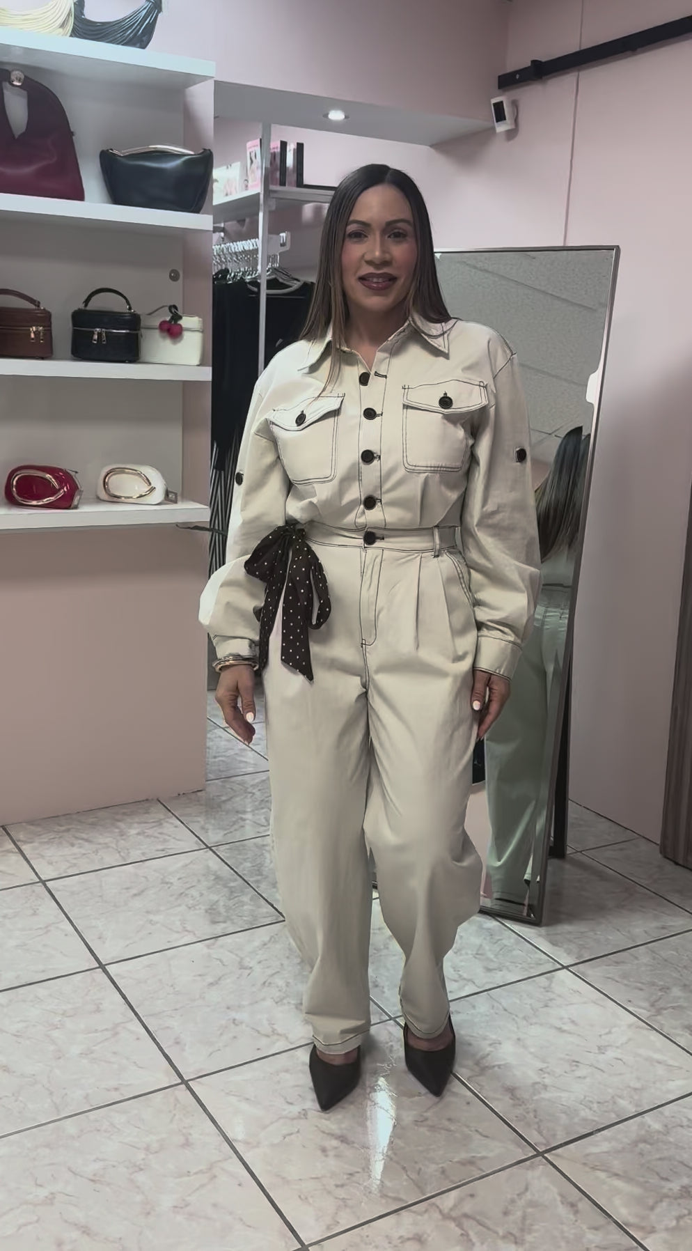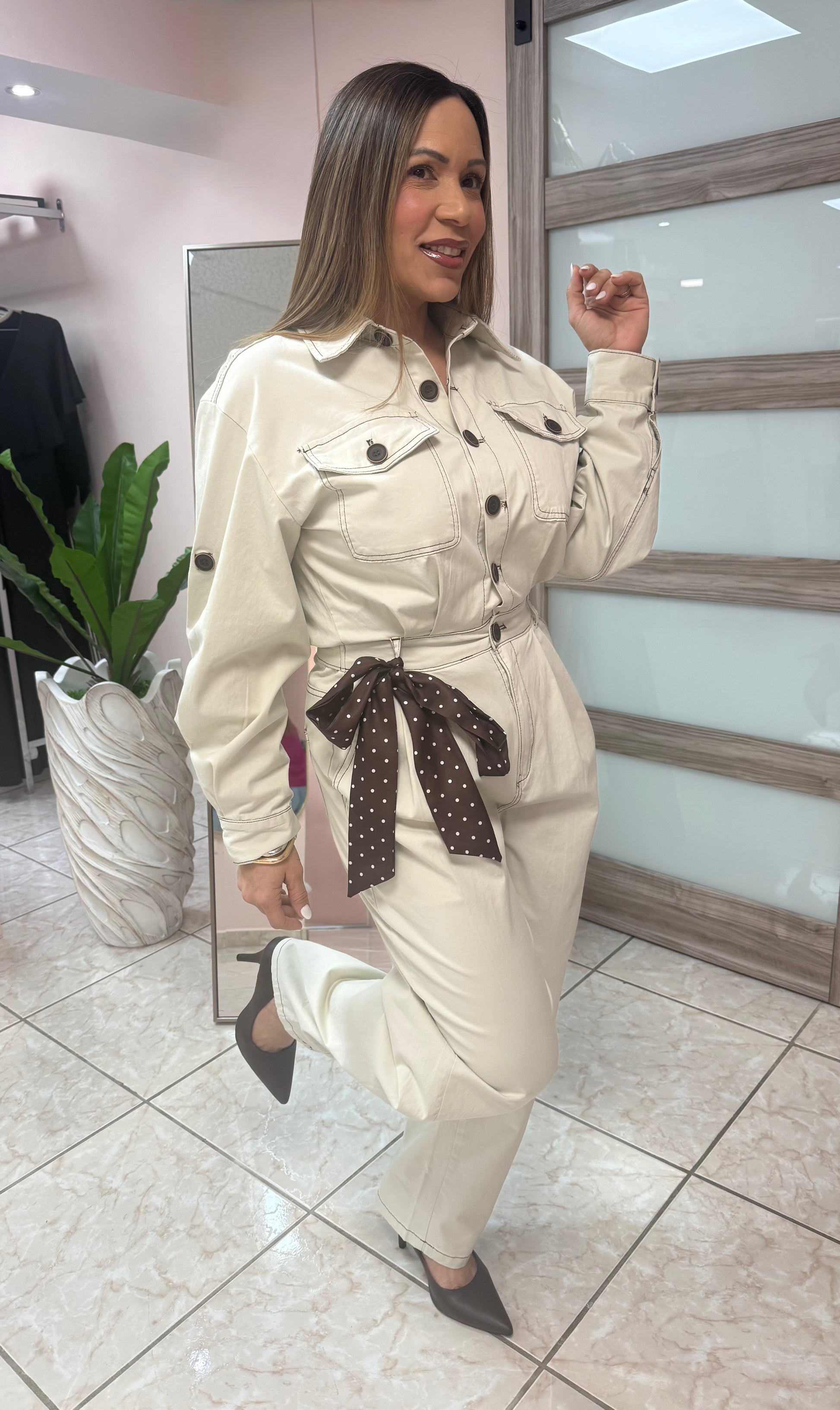 Jumpsuit espectacular color crema. Modelo usa talla Small. Ver video para más detalles)