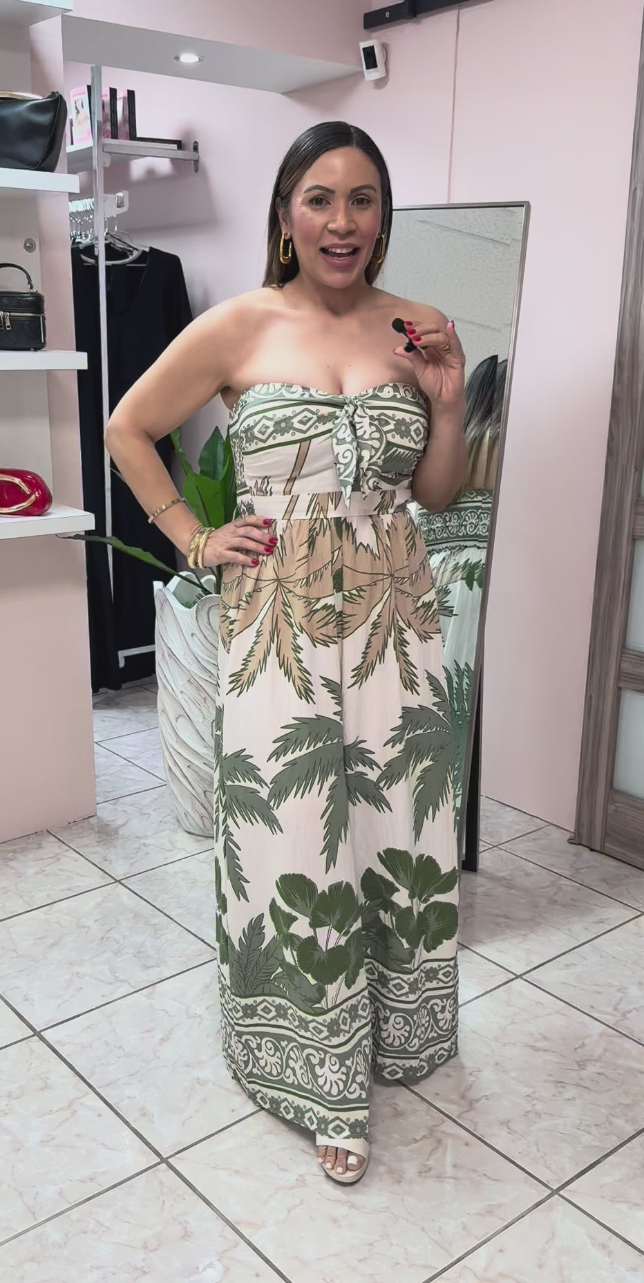 Jumpsuit estampado tropical estilo Strapples , tiene elástico en la parte de atrás. Modelo usa talla Small.