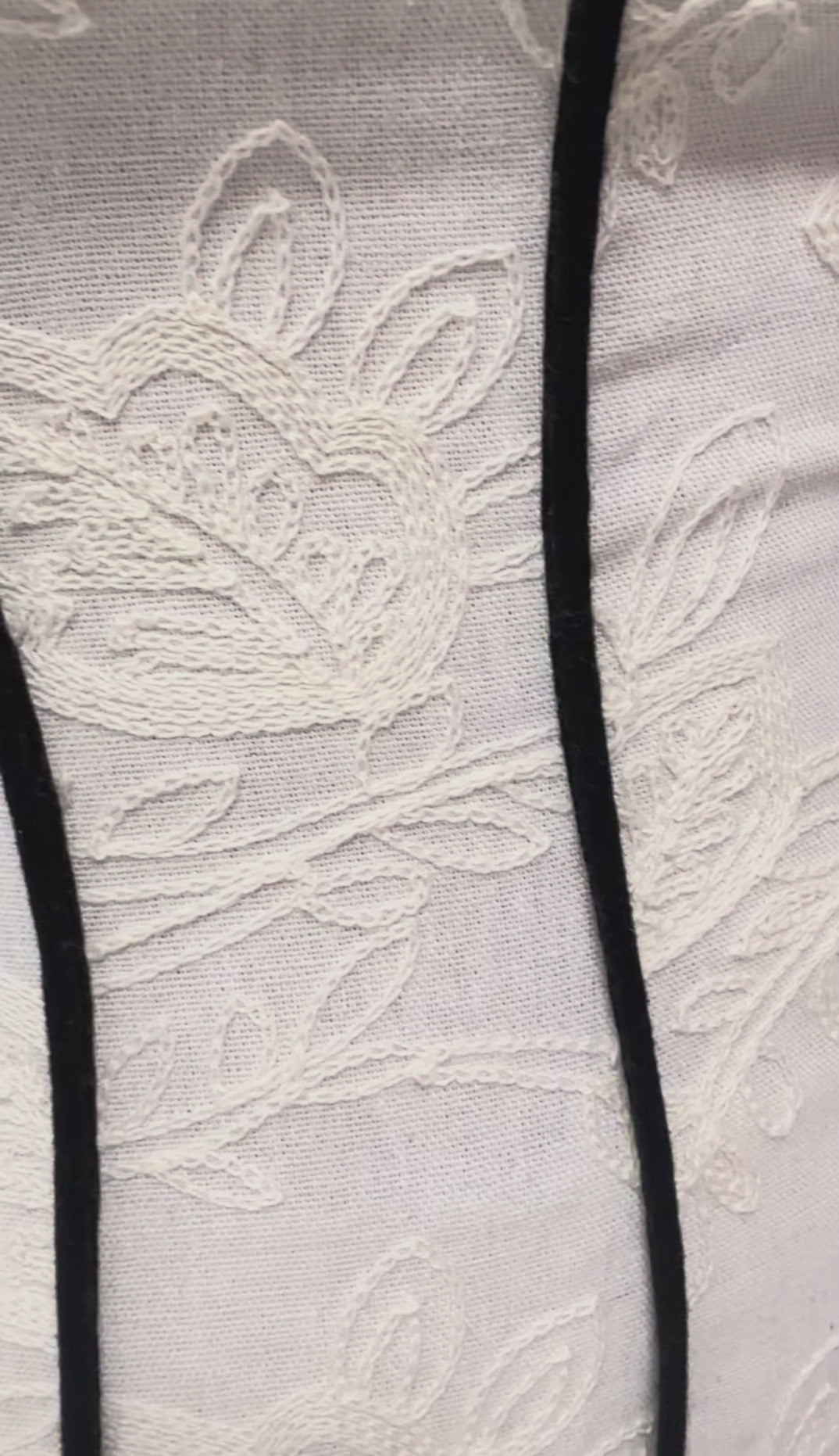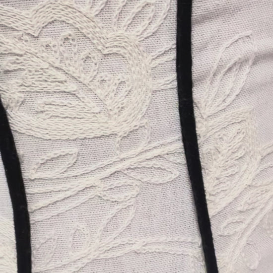 Hermoso vestido en lino bordado con líneas negras. El tiene elástico en la parte de atrás y zipper al lado. Modelo usa talla Medium